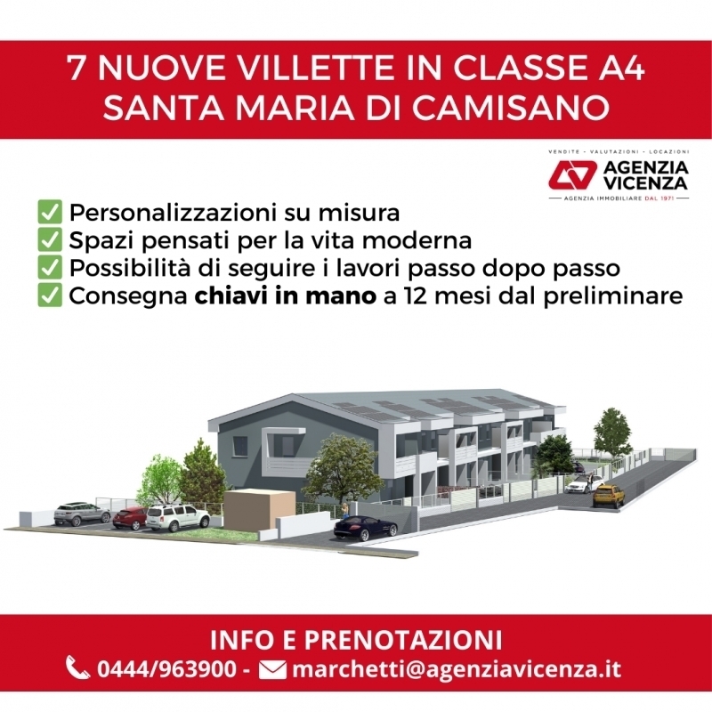 Schiera di nuova costruzione in classe a4 a santa maria di camisano vicentino - rif. 8099consegna a 12 mesi dal preliminare 'chiavi in mano'sono iniziati i lavori per la realizzazione di 7 eleganti villette a schiera in via bachelet, nel cuore di un tranquillo e servito quartiere residenziale, circondato da abitazioni moderne e curate.l'unità immobiliare che vi proponiamo in questa scheda è la a6: porzione di schiera centrale.si sviluppa su due livelli: al piano terra ampia zona giorno di circa 51 mq, con cucina a vista, sala da pranzo e soggiorno. la zona giorno beneficia di grande luminosità, grazie ad un'ampia porta finestra che dà accesso diretto al giardino esterno. sempre al piano terra troviamo un bagno finestrato, lavanderia separata e il garage singolo con accesso diretto dalla zona giorno.al piano primo si sviluppa la zona notte con tre camere: una matrimoniale con zona guardaroba/cabina armadio e bagno padronale, una seconda camera matrimoniale, un'ampia camera singola con terrazzo, ed il secondo bagno finestrato con accesso al terrazzo.completa la proprietà un portico di 10 mq e un piccolo giardino che si sviluppa sia sul fronte che sul retro della casa.n.b. Le foto sono relative ad altra nuova villetta della stessa lottizzazione, già rifinita come potrà essere rifinita questa unità immobiliare.chiamaci ora per avere tutte le informazioni sulle caratteristiche costruttive e sulla personalizzazione delle finiture!consegna 12 mesi dal preliminare - chiavi in manofissate una visita con i nostri consulenti immobiliari!per info: marika piana cell. 347/4450880agenzia vicenza sas di marchetti andreavia legione antonini 146 vicenza - 0444.963900aderente alla borsa immobiliare della c.c.i.a.a. Di vicenzawww.agenziavicenza.it - marchetti@agenziavicenza.it