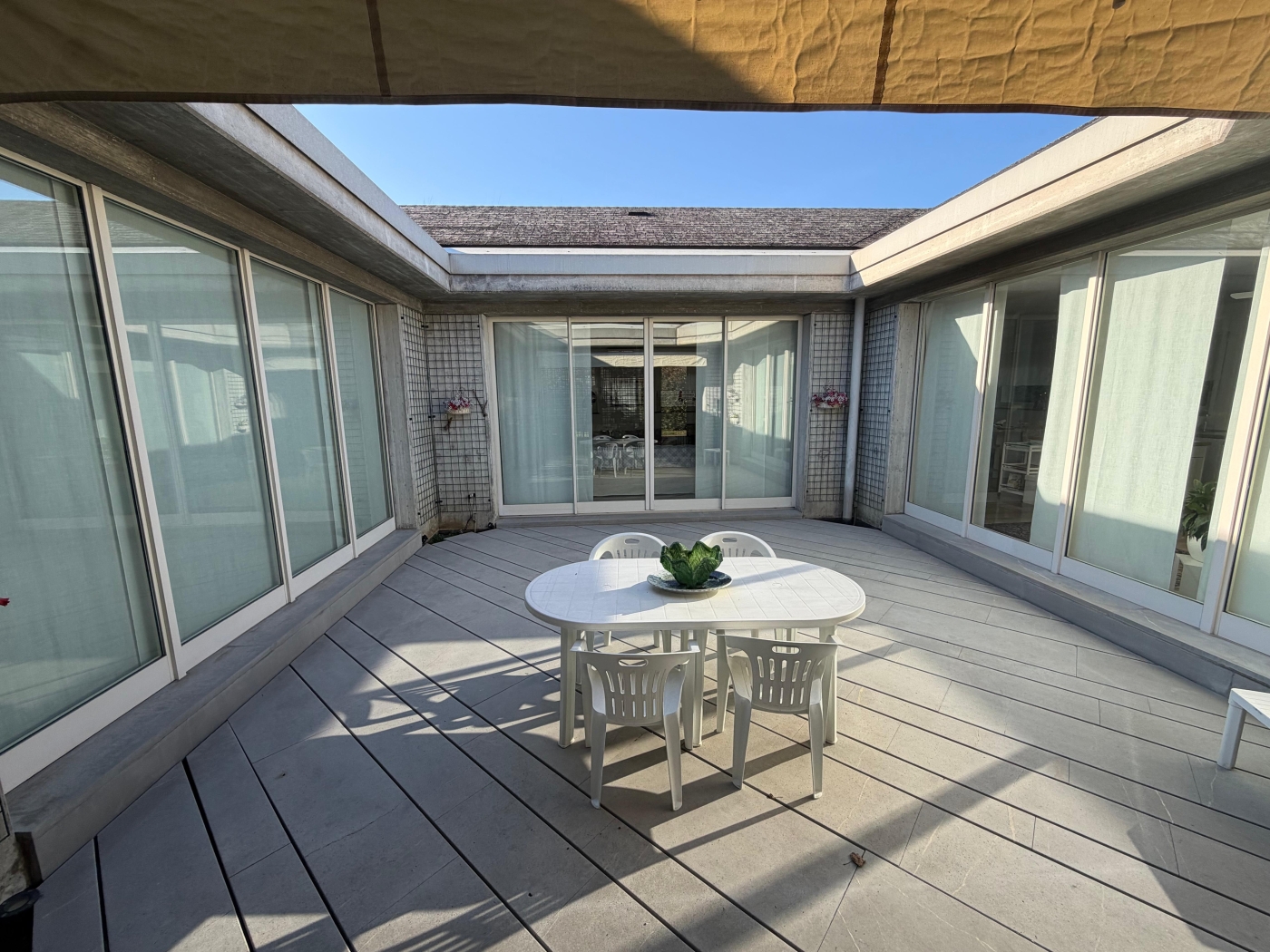 l’abitazione si sviluppa su una pianta quadrata di circa 348 mq, organizzata attorno a un suggestivo chiostro centrale, vero fulcro della casa, sempre visibile grazie alle ampie vetrate che mettono in dialogo tutti gli ambienti principali con questo spazio intimo e luminoso.