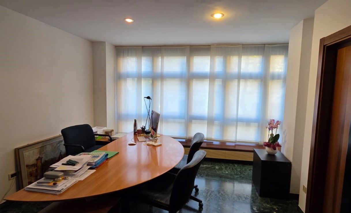 In palazzo prestigioso luminoso ufficio al piano 1° così composto: ingresso/ sala d'attesa, 4 vani ad uso ufficio, di cui uno con piccolo terrazzino e due bagni. L' ambiente è climatizzato in ogni stanza, i serramenti sono in alluminio con vetrocamera, pavimentazione in marmo serpentino. Al piano terra, comodo posto auto scoperto di mq 14 con accesso carraio automatizzato, mentre al piano secondo scantinato, spaziosa cantina. Attualmente locato fino a giugno 2027 con ottima rendita. Ideale come immobile a rendita e riaccatastabile in futuro in un bellissimo ed elegante appartamento bicamere biservizi. Disponibilità di acquisto di ulteriori due posti auto nella corte condominiale.